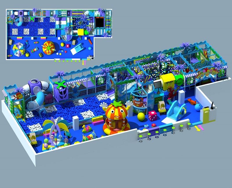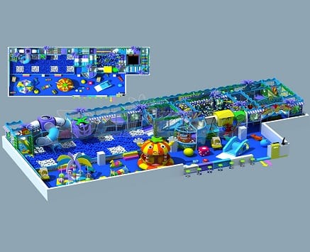 To increase play value and commercial efficiency, the theme integrates scene-based attractions such as ship-style climbing modules, wave-slide systems, and a mini carousel presented as a harbor pier landmark for photo interaction. A party room styled as a ship cabin supports high-margin birthday services, while an explorer mission card encourages children to complete activities to earn badges, driving longer dwell time. This theme strengthens repeat visitation, improves conversion rates inside the mall, and supports long-term branding without exceeding the $300,000 investment budget.