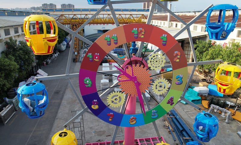 Mini clock Ferris wheel (10–15m): around $30,000 – $60,000 USD. For example, 40 seats clock theme Ferris wheel, its price range is about $50,000
