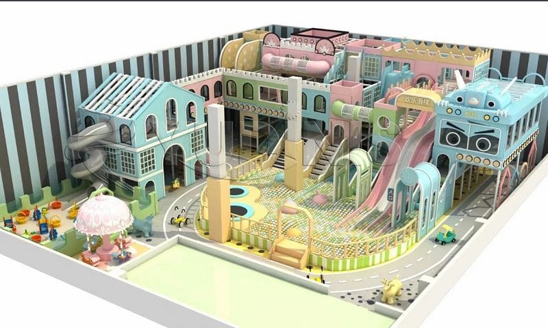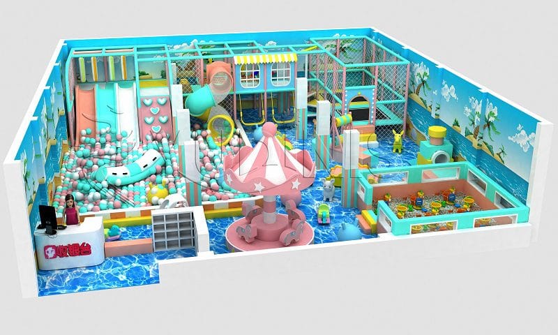 | 500㎡ | – Multiple themed zones (Jungle, Macaron, Ocean) – Medium slides, climbing frames, role-play areas – Café & parent seating | $80,000 – $150,000 | Turnkey solution recommended: layout planning, 3D design, equipment customization. |